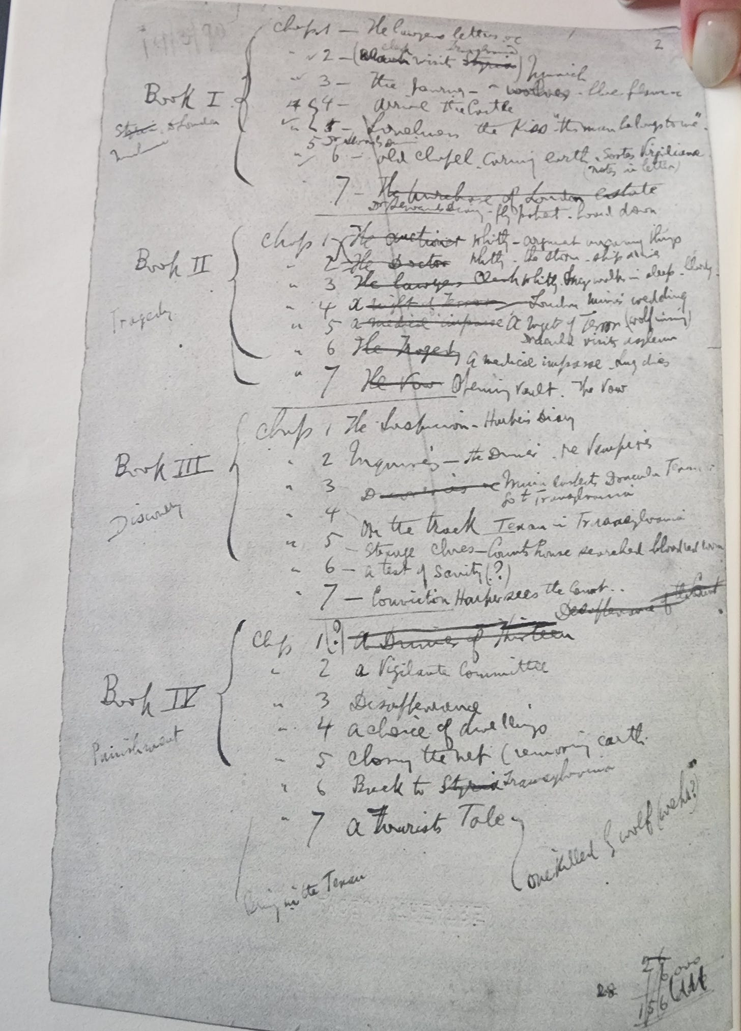 On the bottom right corner of the above picture, you will find a scribbled calculation. When inspected closely, we can see that Bram is using the number of planned chapters to get an approximate word count of the final manuscript. After this one page outline, Stoker worked through each section and chapter in greater detail.